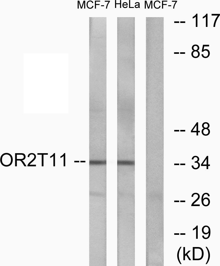 Olfactory receptor 2T11 Polyclonal Antibody detects endogenous levels of Olfactory receptor 2T11 protein.